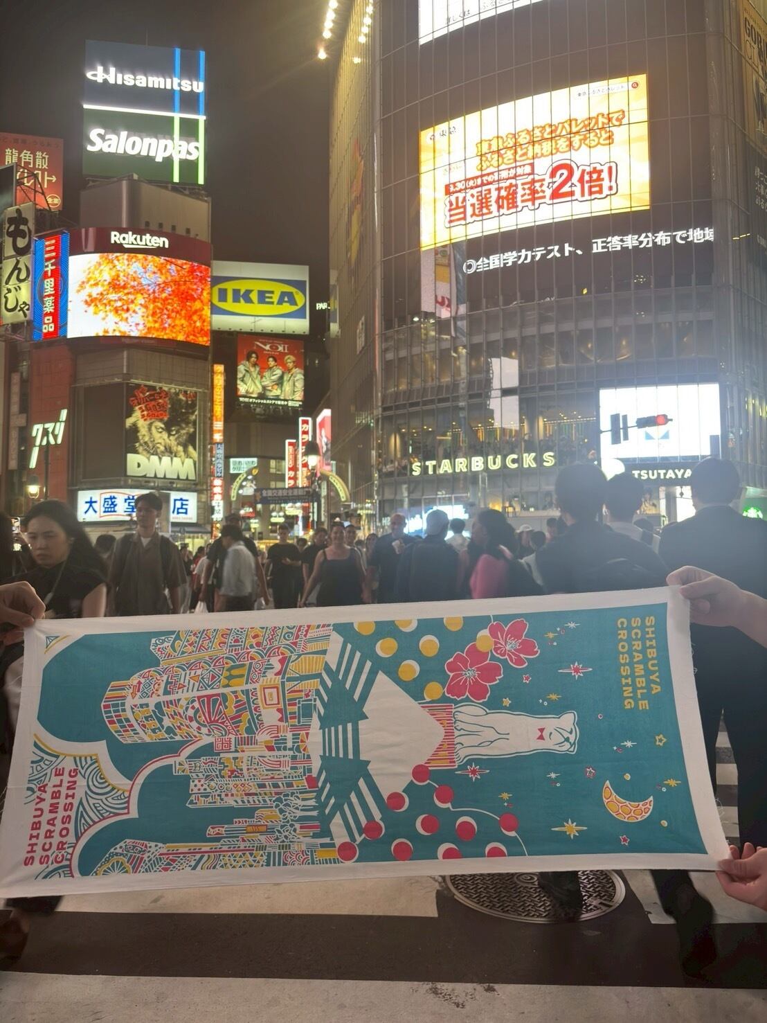 ハチ公と渋谷スクランブル交差点を組み合わせた都会的でスタイリッシュなデザインと、木綿ならではのやさしい肌ざわり。タオルやハンカチとしてはもちろん、壁に飾ればインテリアに、贈ればセンスのいいギフトに。使うたびに日常がちょっと特別になる一枚です。